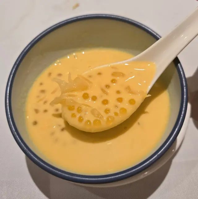 楊枝甘露一顆顆嬌小的西米露在楊枝甘露閃著晶瑩剔透的光澤多誘人,入口富有咬感,飽水的柚子果肉飄出清香,加上極濃稠的芒果基底香甜,楊枝甘露也為這餐畫上完美的句點。