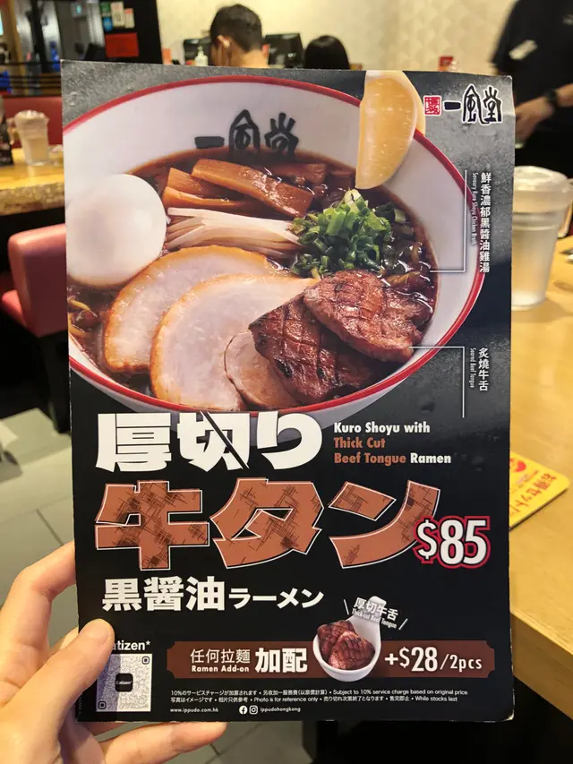 最近推出期間限定嘅「厚切牛舌黑醬油拉麵」,特製香濃黑醬油雞湯底,鮮香濃郁;同時加入背脂,令湯底更添香氣,鹹香滋味!配搭炙燒厚切牛舌片,口感彈牙,嚼勁一流,味道濃郁,齒頰留香~仲有一風堂招牌卷腩叉燒同原隻玉子,匯聚多款滋味食材,味道同口感都好豐富哦