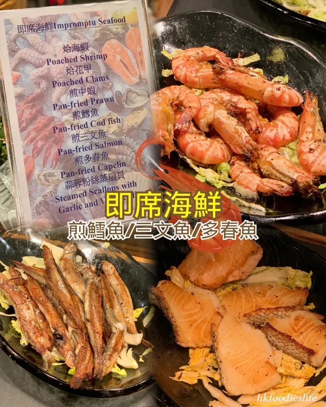 煎鱈魚、煎三文魚、煎蝦、煎多春魚、蒜蓉扇貝……..