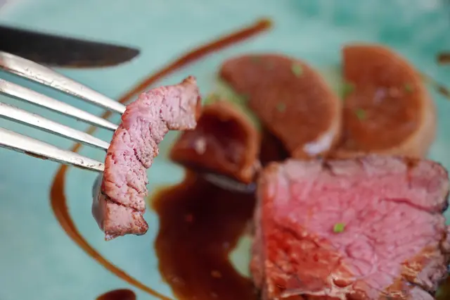 香煎牛柳配日式蘿蔔佃煮:外層煎至微焦的牛柳,中間的部份仍保留粉嫩肉汁。