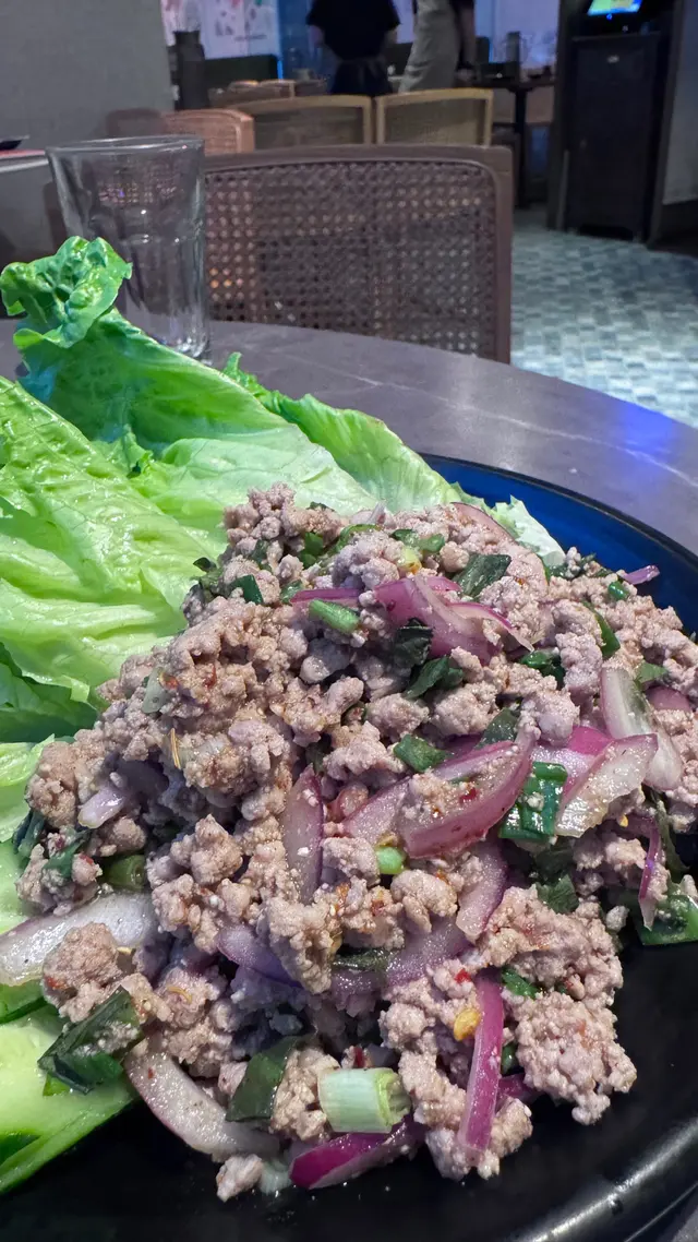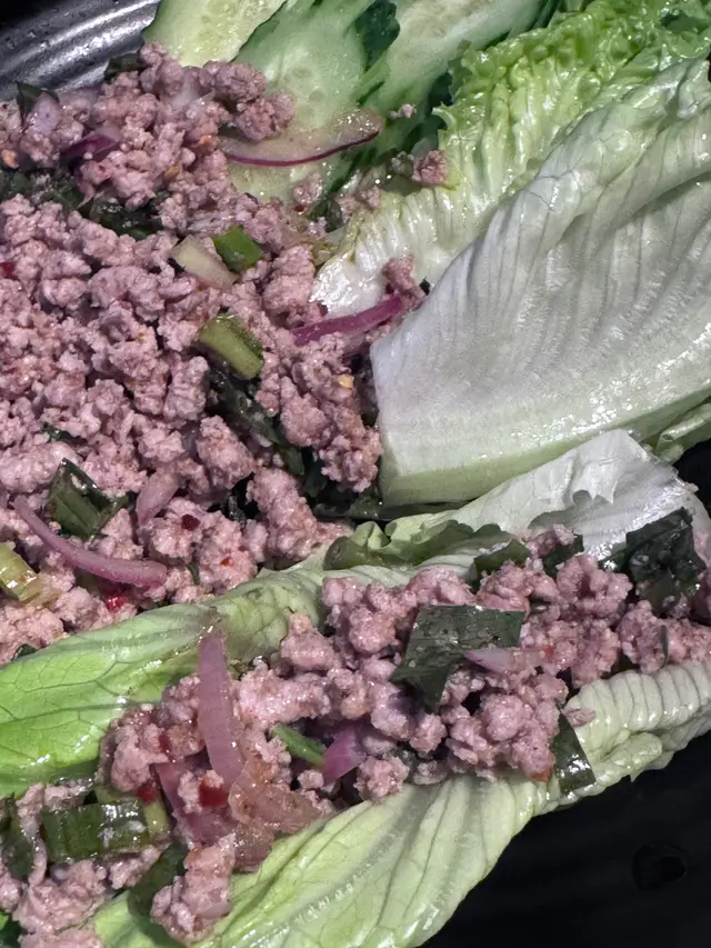 $95「豬肉肉碎生菜包」:豬肉肉碎有肥有瘦整體嚟講脂肪含量充足所以好甘香仲似乎加咗啲蒜蓉青檸汁香料等等,味道鹹鹹哋,用新鮮爽脆嘅生菜包住嚟食,非常開胃🤣