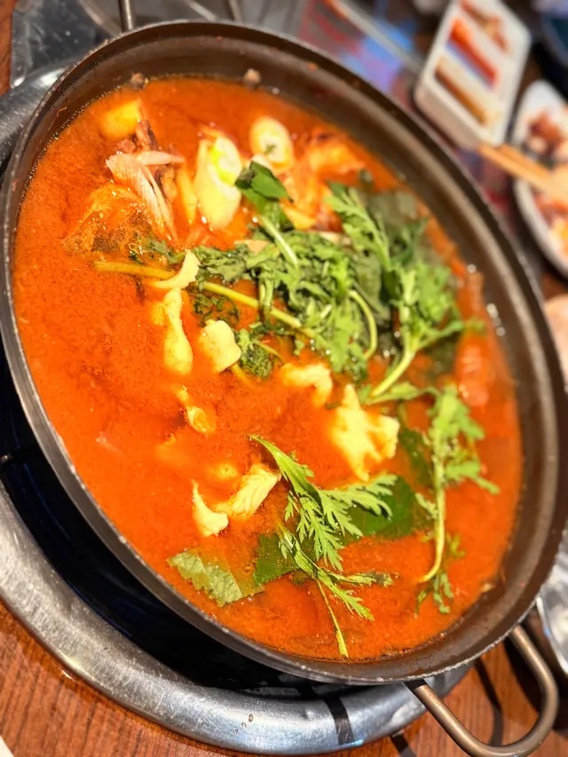 🥣 韓式辣魚骨湯濃郁魚香,辣度剛好,加手搓刀削麵,暖胃又好玩!