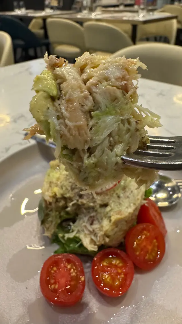 $148「蟹肉牛油果沙律」:牛油果🥑壓爛同大量蟹肉撈埋一齊,真係有好多蟹肉🦀🤣,好鮮味亦都感覺清新,下邊仲鋪咗一層 Arugula 火箭菜,旁邊仲放咗車厘茄,都好味🤣;仲有,店員姐姐話呢個係餐廳 Signature Dish 🤣