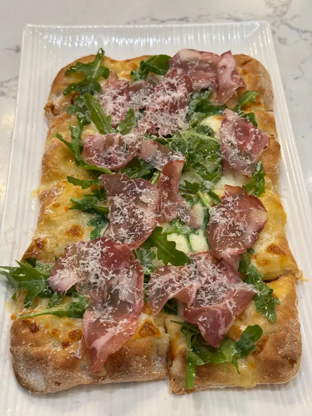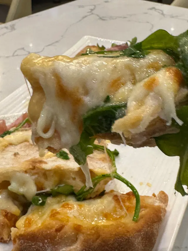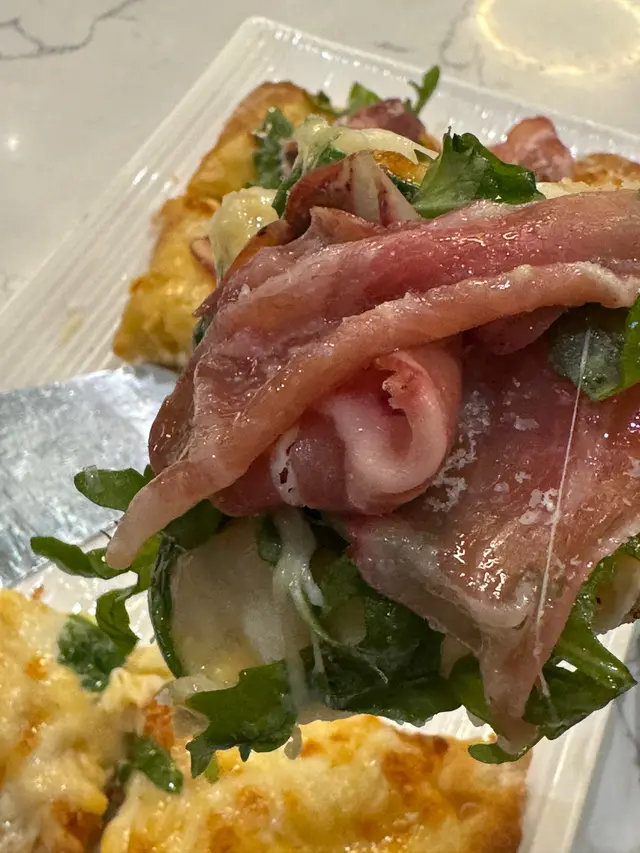 $158「火腿芝麻菜披薩」:材料包括 Parma Ham, Rocket, Mozzarella Cheese, Parmesan Cheese 意大利火腿、火箭菜、水牛芝士、巴馬臣芝士🧀🤣;生麵糰 dough 外邊脆脆哋裏邊少少煙靭,水牛芝士同巴馬芝士熱熔咗有啲啲鹹香,意大利🇮🇹火腿又係有鹹香,整體好食😋