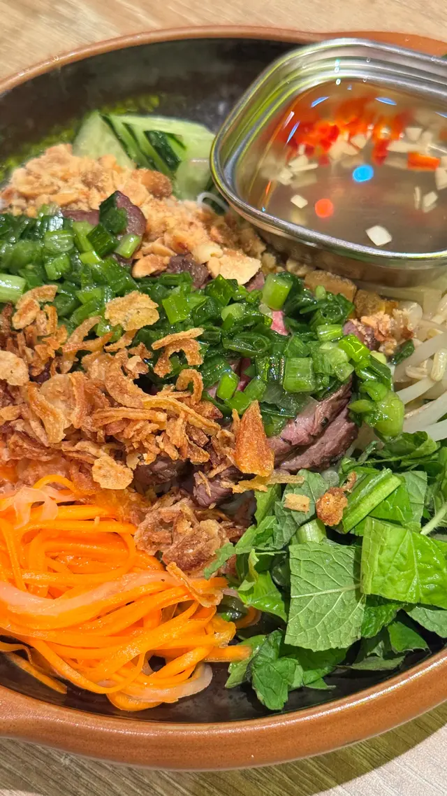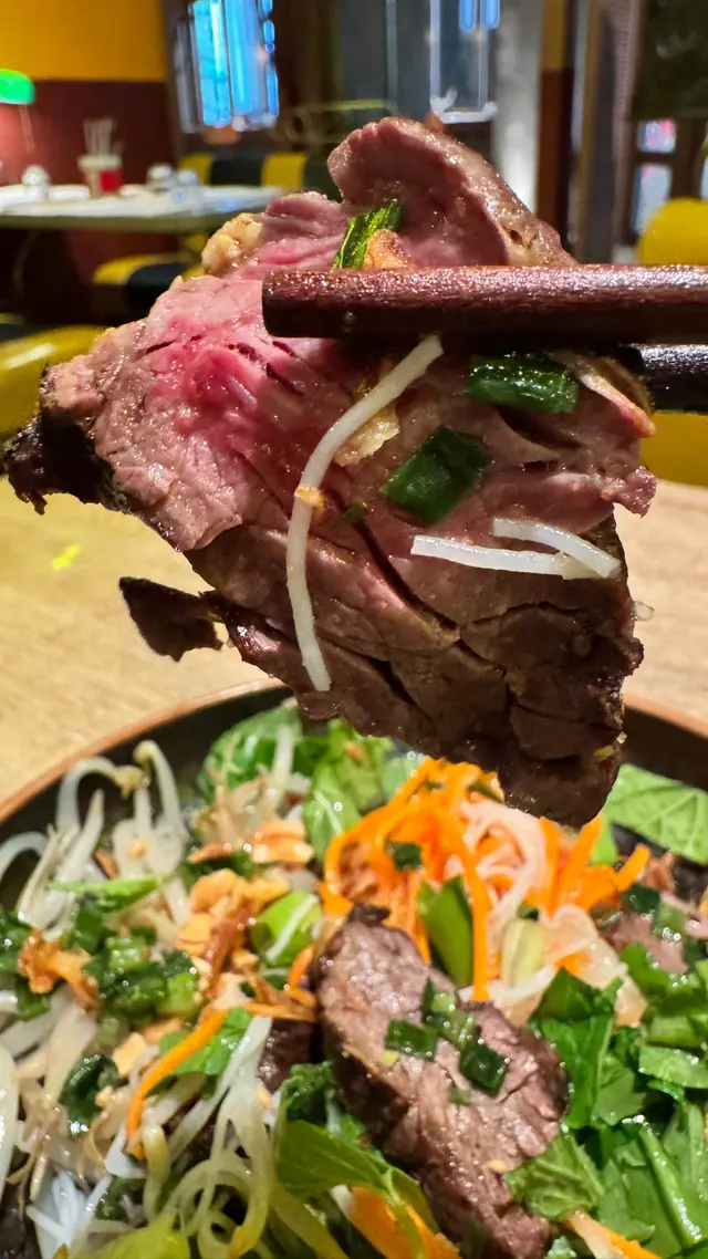 BKK Thai Beef Salad 炭燒封門柳沙律配米粉跟特色醬汁:材料包括《Grilled beef salad with assorted vegetables and homemade sauce 炭烤澳洲牛肉、蔥、芫荽、番茄、乾蔥、辣椒》🤩;炭烤澳洲牛肉烤到大約8成熟,肉質軟熟好牛味🤣;食之前將自家製醬汁同所有材料撈勻一齊食,加有芫荽嘅沙律菜同埋酸酸甜甜嘅沙律汁,食得好開胃🤣