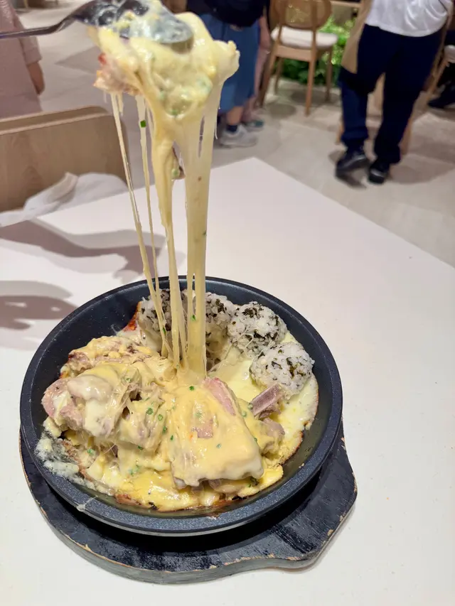 $238「拉出一絲絲芝士排骨鍋」:排骨肉質幾軟熟,配埋拉絲芝士,幾好玩又幾好食🤣,店員妹妹仲幫我哋拉絲🤣,仲有紫菜飯團可以食,都係可以撈埋拉絲芝士一齊食🤣