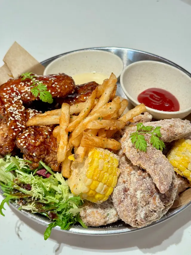 $258「半半炸雞」:揀咗有骨嘅炸雞,口味就揀咗「吃一口就想原諒世界的粟米炸雞」同埋「帶點正宗水原式牛肋骨醬炸雞」,名字有啲啲鬼馬,幾好玩🤣;「吃一口就想原諒世界的粟米炸雞」炸得外邊乾身幾香口🤣,「帶點正宗水原式牛肋骨醬炸雞」甜甜哋鹹鹹哋濕濕哋味道幾得意🤣