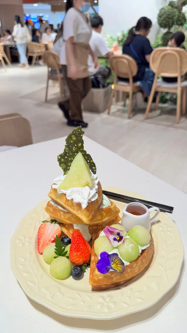 $132「比初戀還要甜的蜜瓜窩夫」:綠色嘅蜜瓜用匙羹𢳂成一小粒一小粒咁樣,細細粒,容易入口,味道非常清甜,好好食🤣;窩夫暖暖哋脆脆哋,配埋鮮忌廉同埋蜜瓜醬,都幾甜,幾好食🤣
