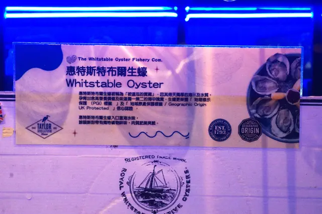 雖然蠔款甚多,但不得不介紹一吓店家獨家供應嘅英格蘭「惠特斯特布爾生蠔」(Whitstable Oyster),睇番佢哋嘅介紹,呢款蠔因為晌得天獨厚嘅海牀同水質,能孕育出含高營養價值及味道獨一無二的生蠔,亦被稱爲「被遺忘的寶藏」。最堅嘅喺獲得受歐盟「地理標示保護標籤」(PGI)同英國頒授嘅「地域原產保護標籤」 (Geographic Origin UK Protected),絕對喺信心嘅保證。店員補充,除咗晌西營盤或大坑嘅分店享用到之外,仲有晌作為香港獨家經銷商「一田超市」搵到佢哋嘅蹤影