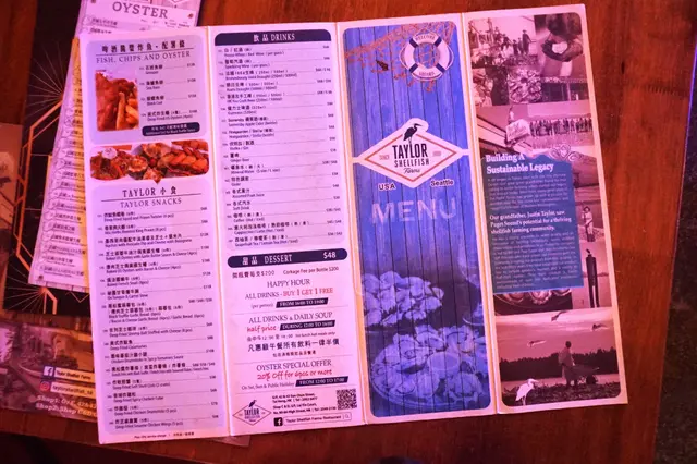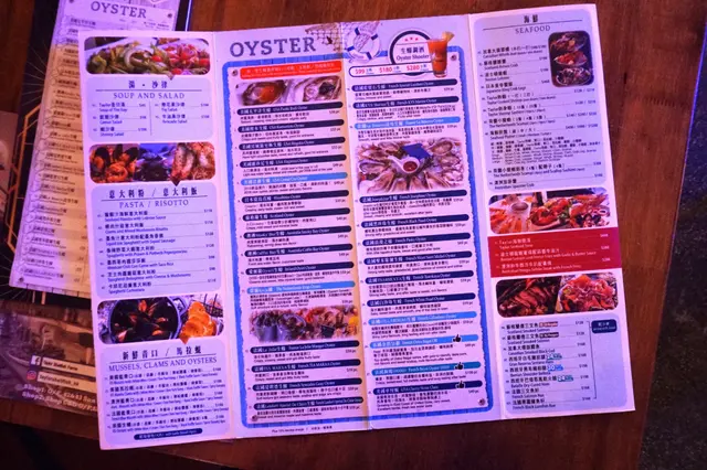 再睇一睇餐牌,就睇到蠔嘅品種實在非常之多,此外,仲提供好多其他唔同種類嘅海鮮菜,例如青口、馬拉蜆、翡翠螺、麵包蟹、小龍蝦、波士頓龍蝦……等等。其次仲供應湯品、沙律、小食、炸魚薯條、意大利麵、意大利飯、扒類、甜品