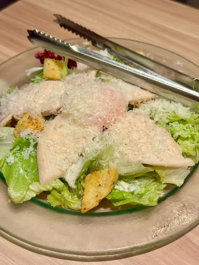 溫泉蛋慢煮日本雞肉凱撒沙律:沙律菜新鮮,雞肉幾軟熟,撈埋溫泉蛋,咁又好食啲🤣