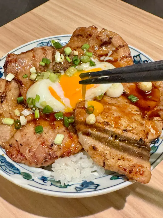 北海道名產 溫泉蛋十勝豚肉丼:豚肉片燒到微焦,撈埋圓轆轆脹卜卜嘅米飯同埋溫泉蛋一齊食,幾好食🤣