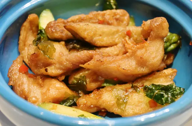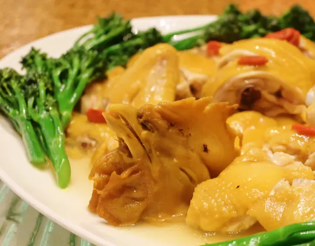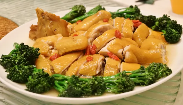本地農場飼養,無添加激素,大廚干師傅也特別選用公雞入饌,因其肉質更結實而又脂肪少,將雞隻放入加了當歸、瑤柱和蝦米等材料的滷水汁浸熟,入口雞肉嫩滑又爽口,滷水盡滲其中,非常入味,而蒽油也是經師傅特調,同樣不能錯過