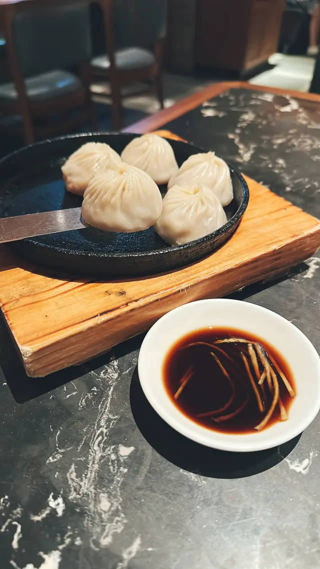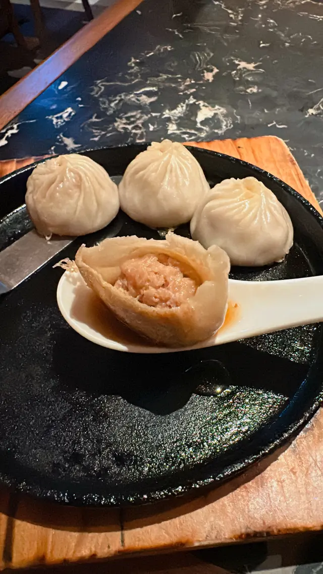 原塊鐵板上嘅小籠包,所以仲係熱辣辣,小籠包放係鐵板上煎糅合生煎包口感,但咬開依然係爆湯汁小籠包,皮薄肉多好滿足!