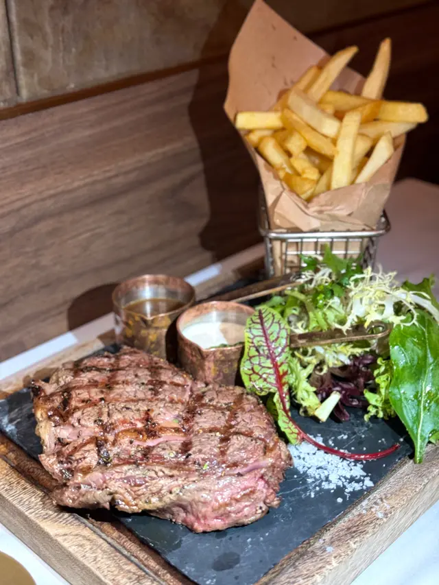 非常推薦大家嗌呢一個炭燒澳洲穀飼肉眼牛扒,炭燒出嚟嘅牛扒特別重炭香,牛扒上炭燒嘅紋理亦都好清晰,穀飼肉眼扒嘅牛味超級濃郁,310g亦都好厚身,嗌medium raw啱啱好,另外有沙律菜同薯條做配菜,食完兩個人都好飽