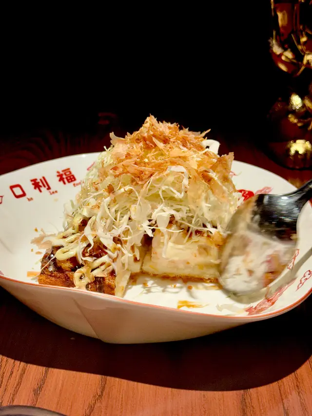 在港式蝦多士上唧上大阪燒上灑上海量野菜絲,唧上特有的蛋黃醬和燒汁,𝐭𝐨𝐚𝐬𝐭酥脆無比,可惜中層蝦膠略嫌有點鹹🥶