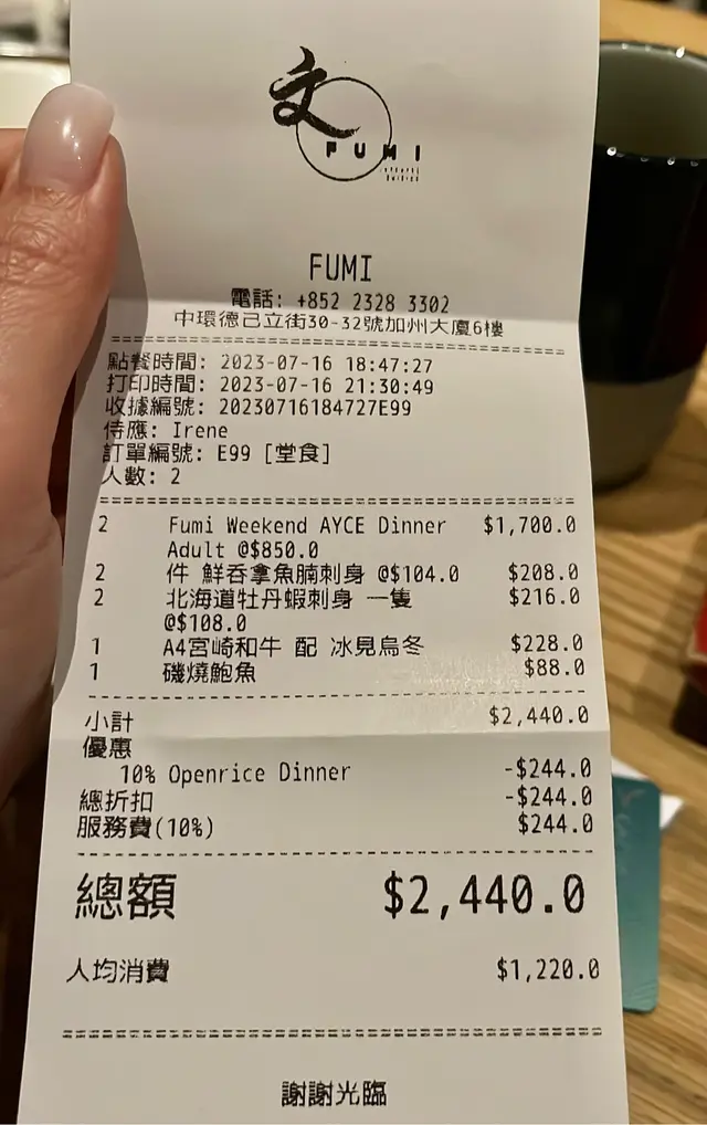 最後埋單每位$1,220,環境寬敞,Service正常,大家想食好野,又驚over budget,可以係到放心食。 (笑)