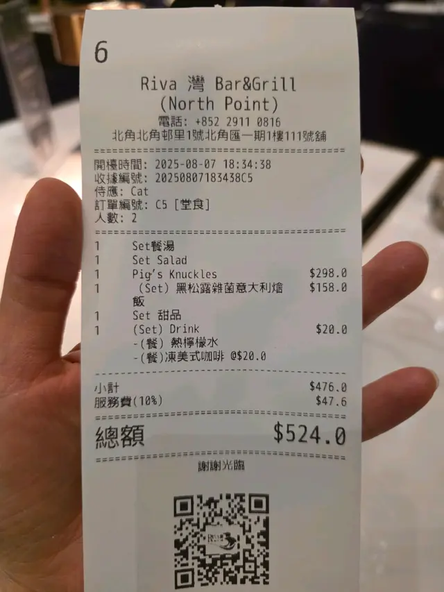 【北角慢活海景西餐廳】 numbaseventeen等级42025-09-18160 浏览 关注 坐在餐廳靠窗的位置,敞亮的窗戶引進自然光,𣊬間感受悠閒的慢活節奏✨ 紫金的裝潢搭配綠植點綴,加上海景🌤️,優雅且舒適。餐廳外也有人竉共融的地方用餐,可帶你的毛孩同行🐕🦺🇩🇪德國脆皮豬手 $298主廚將豬皮烤得香脆,聲控會吃得很歡欣😆皮下脂肪化為感覺不油膩的膠質,搭配帶甜的柚子蜂蜜醬也很有特色🍯。薯條新鮮出爐超辣口🍟加了點粉炸過,比一般的更脆口! 🍄黑松露雜菌燉飯 $158燉飯米芯保留微硬口感,雜菌炒後的香氣加倍,每勺都能挖到菌菇,很足料,素食者的美味選項🌱! #香港美食 以上食记乃用户个人意见 , 并不代表OpenRice之观点。赞好分享【北角慢活海景西餐廳】 RIVA 灣 Bar & Grill https://s.openrice.com/QrLT09tDU00检举 张贴 评分4味道5环境4服务5卫生4抵食用餐日期2025-08-07用餐途径堂食人均消费$260 (晚餐)