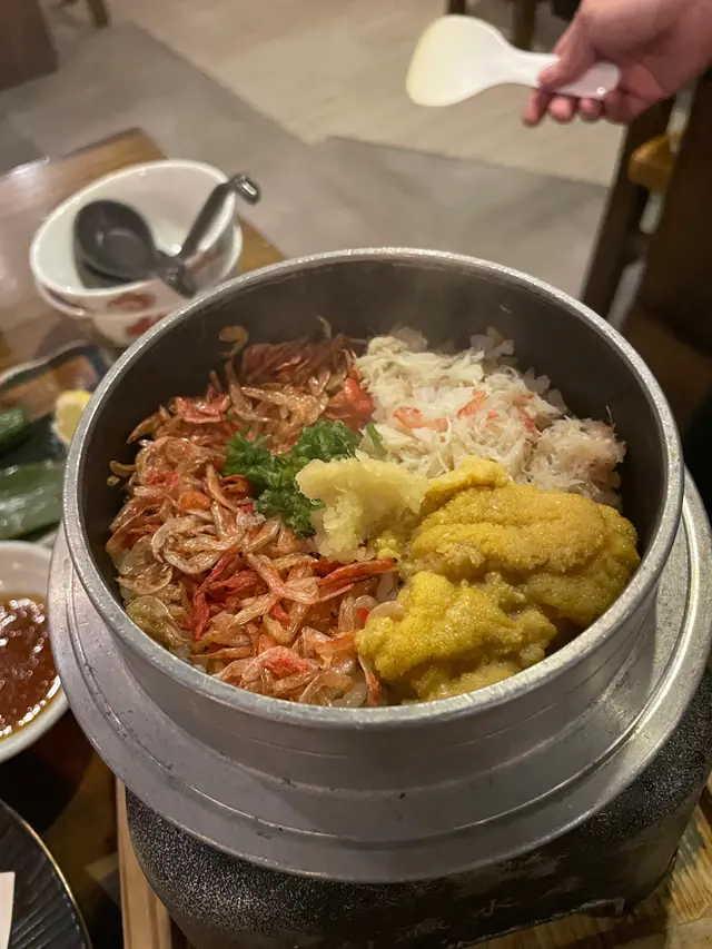 開鍋儀式感滿分!蟹肉如松針層層鋪蓋,三種海膽堆成小山,最銷魂是釜飯底層的焦脆鍋巴——吸飽蟹黃與昆布高湯,形成脆中帶糯的絕妙食感。隨飯附贈的蟹湯竟用蟹殼熬製,鮮度直接提升三個維度!