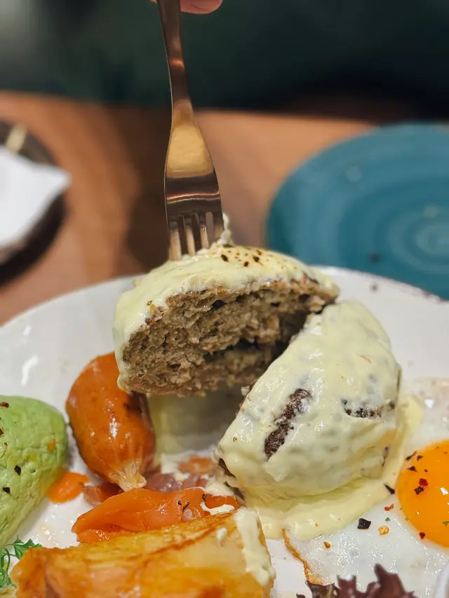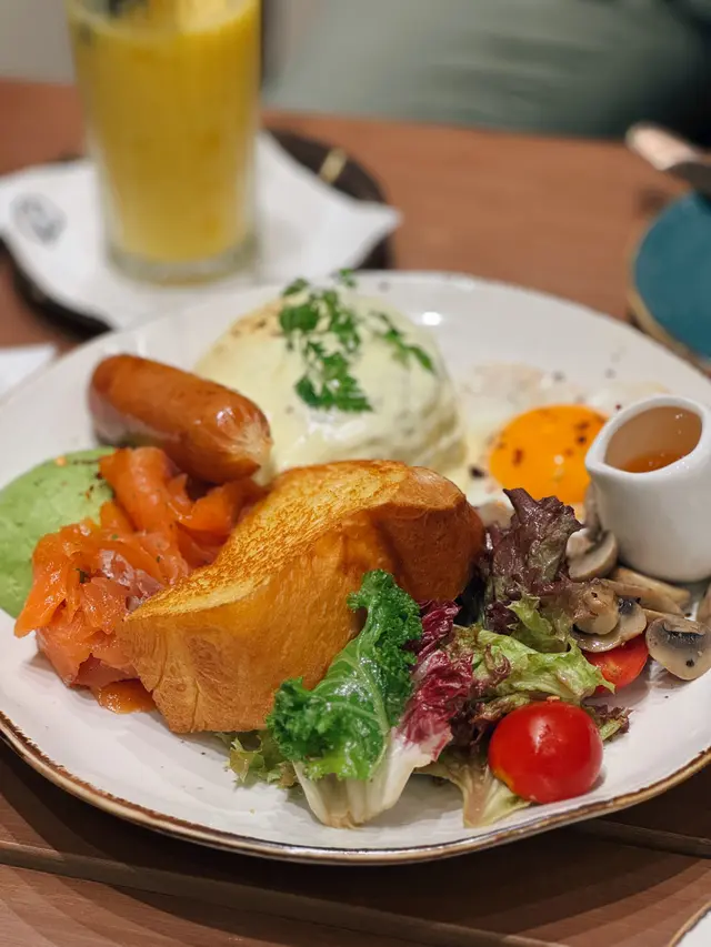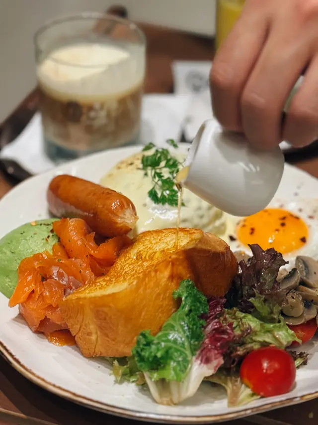 有漢堡扒、牛油果🥑、煙三文魚、煎蛋、蘑菇、蕃茄、沙律菜、楓蜜脆多士😋