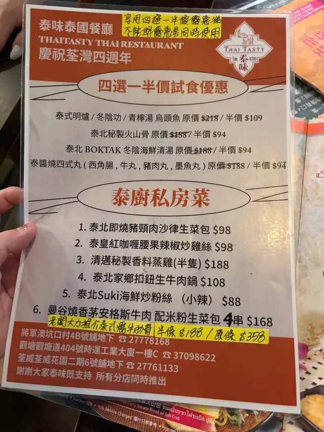 而家泰味三間分店將軍澳,觀塘及荃灣,都做緊四選一半價優惠!我哋揀咗冬陰功湯烏頭魚,有半價!性價比好高!