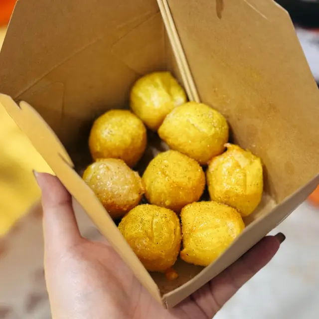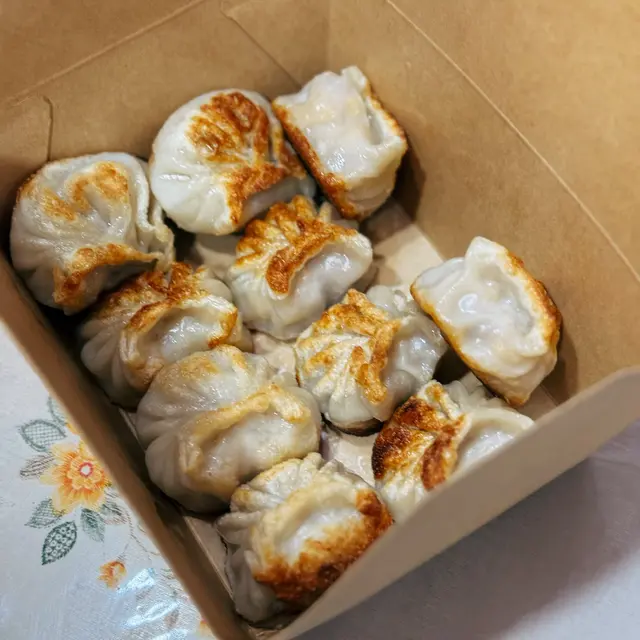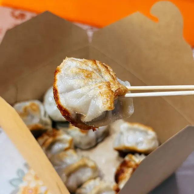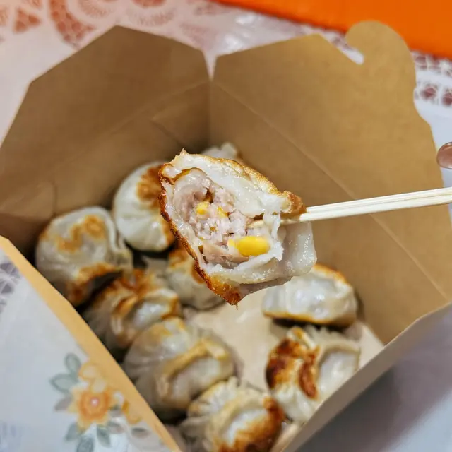 餃子皮煎到金黃脆底,栗米豬肉餡清甜多汁,點辣醬更惹味。