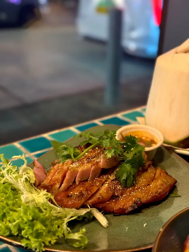 豬頸肉嘅份量好多,食落去有濃郁嘅炭燒香氣,加上泰式酸甜醬好開胃,豬頸肉燒得啱啱好,肉質唔會太乾身,仍然保持到豬肉嘅肉汁同脂肪嘅油分