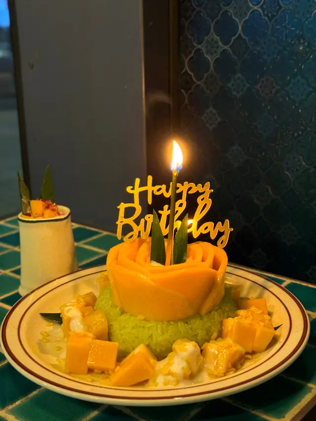 咁啱有朋友生日嘅話可以嗌生日版嘅芒果糯米飯,擺盤超級精緻,將芒果片切成一朵大嘅玫瑰花,中間放滿香濃順滑嘅椰漿,底層鋪滿暖暖嘅斑斕汁糯米飯,預先同餐廳講定仲會有生日牌同生日蠟燭,儀式感滿滿