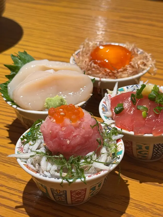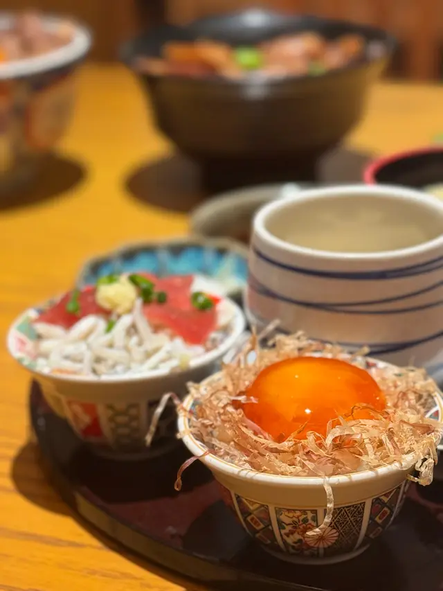 /春之四色刺身定食$108/ 除左四款迷你刺身飯,仲有漬物前菜、無敵順滑嘅茶碗蒸同味噌湯🍳 1/醬油漬蛋配木魚絲丼🪸醬油漬蛋濃而不鹹,配埋木魚絲,鮮味十足,四款入面最有驚喜嘅一款🫢