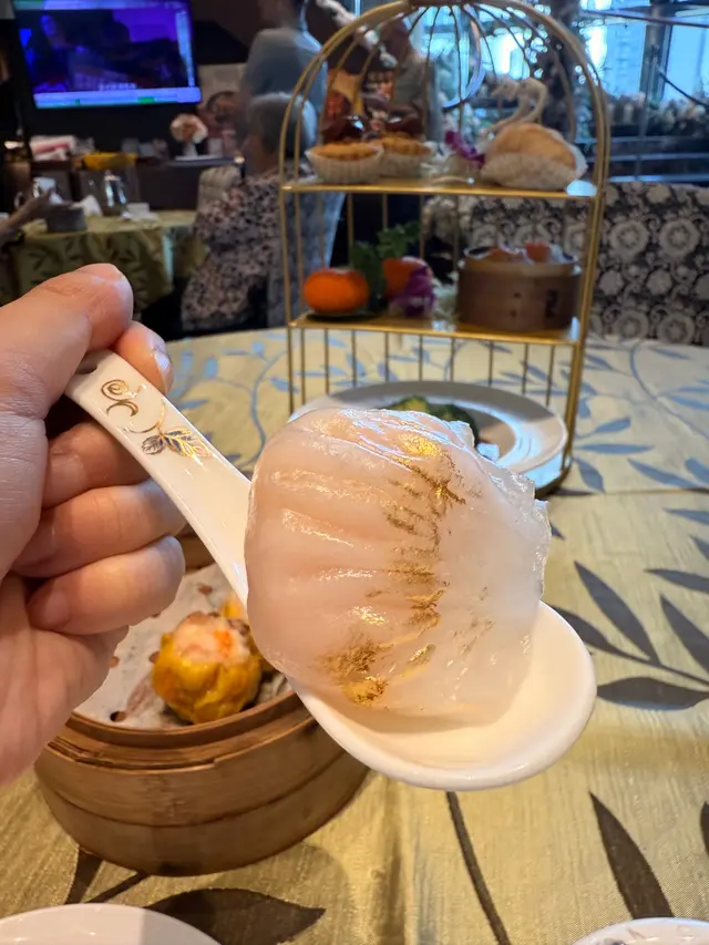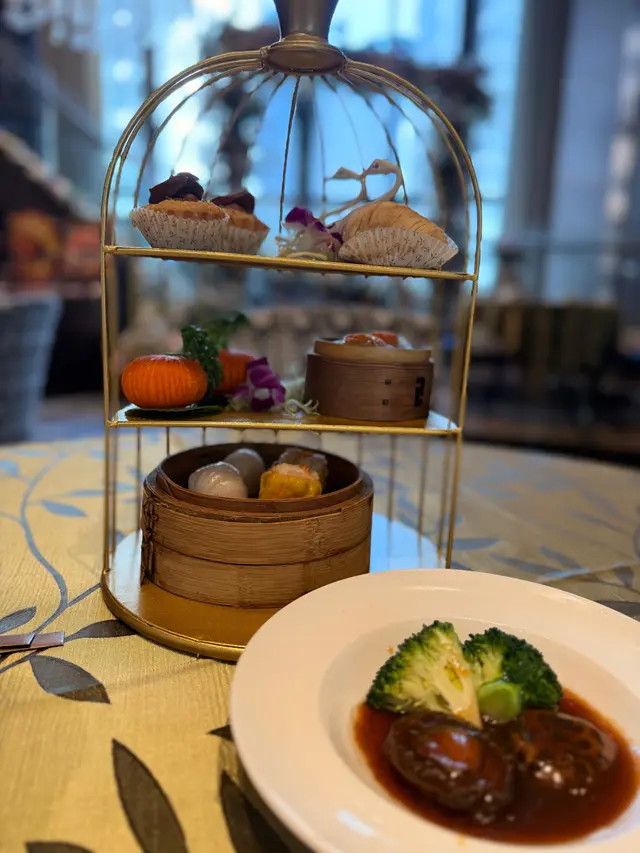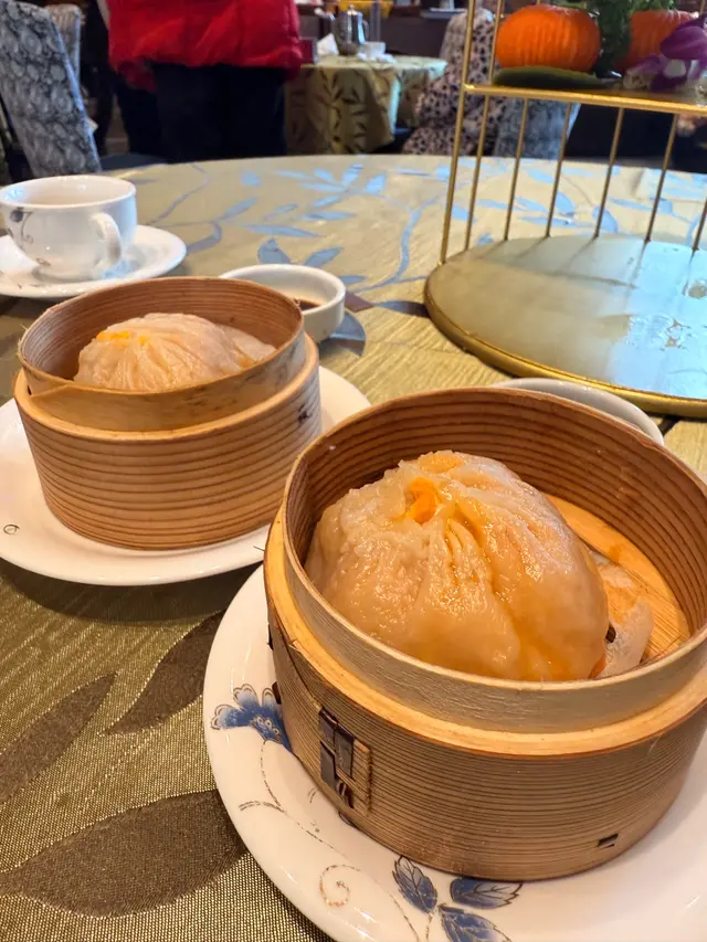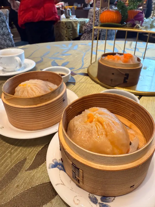 用三層蒸籠裝著六款點心,最下面蝦餃,蝦肉新鮮彈牙。中間的燒賣和鮑魚蛋撻也很好吃,頂層的蘿蔔酥外皮很酥脆。整體擺盤精緻,味道到位。