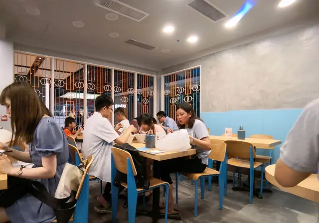 全店裝潢簡潔 以粉藍色沙發椅及通花屏風灌穿全店