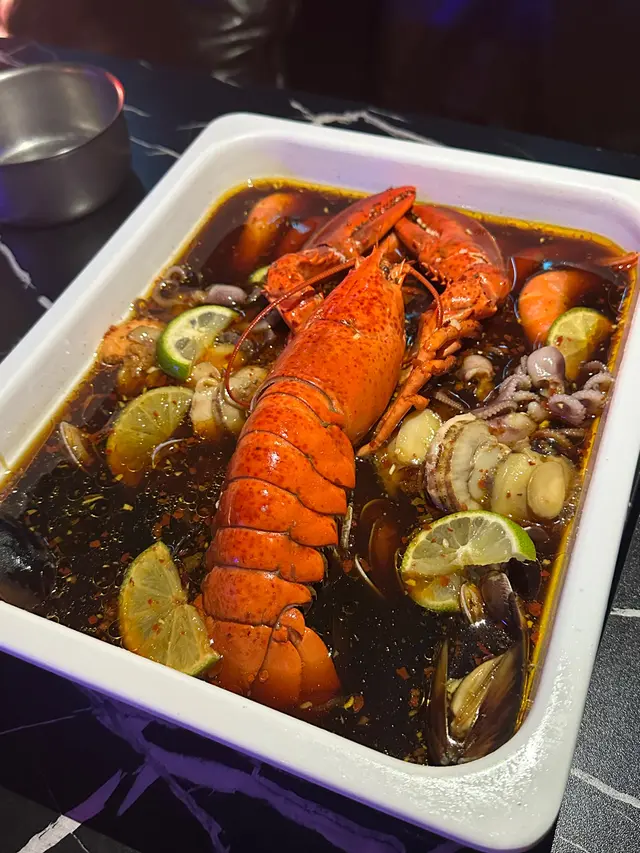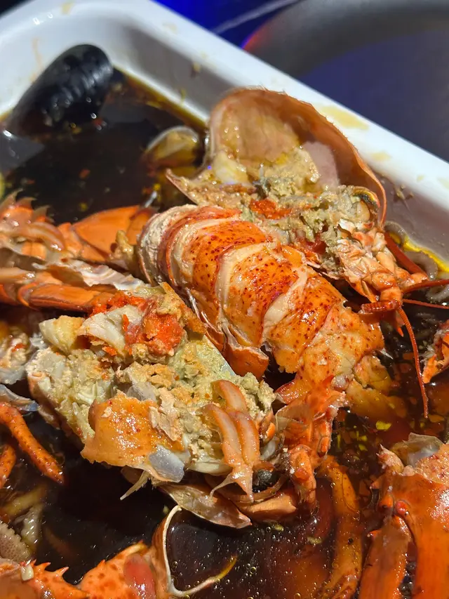 巨大龍蝦🦞原隻上!醬汁微辣清涼,愈食愈滋味,啱哂而家咁熱嘅天氣嘆下~而且鐵盤內有多款海鮮,如:蝦、青口、八爪魚、帶子等,款式多樣,樣樣新鮮!😋