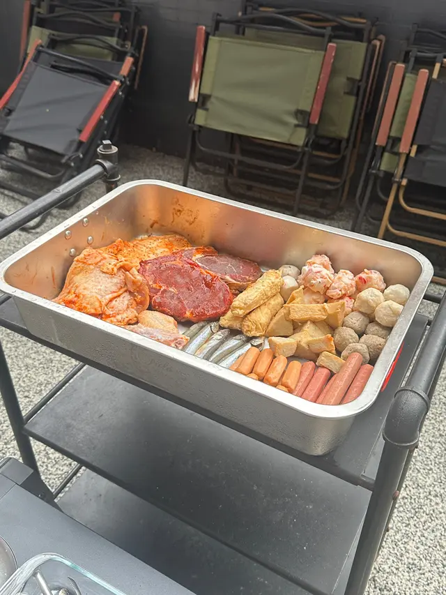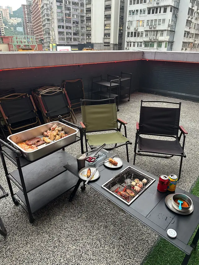 係露營風花園內用炭火自助燒烤,任飲任食,睇住銅鑼灣嘅星星💫嚟燒嘢食都咪話唔浪漫😆雖然室外有啲熱,但店家都細心,特登開個風扇俾我哋涼住~秋涼嘅時候去就啱哂了!