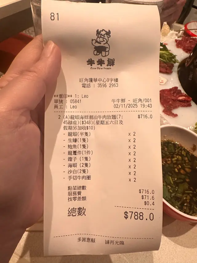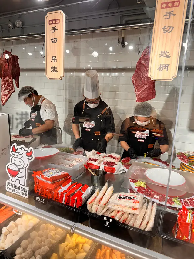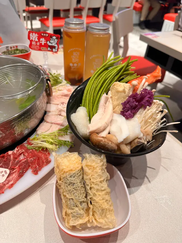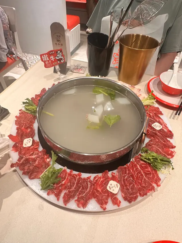 一入坐店員會自動擺上手切牛肉圈轉盤,師傅手切完即上枱,牛肉顏色鮮豔新鮮,轉盤內有不少手切牛肉,吊龍、雪花、五花趾、匙柄及牛胸油,每一種牛肉都寫了需要灼多少秒最合適吃,輕輕一灼就可以吃,牛肉肉質鮮嫩,蘸上豉油醬料,已經提升了不少牛香味。