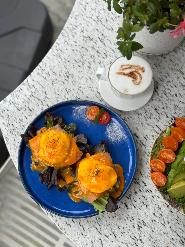𝐁𝐚𝐬𝐞係英式鬆餅,不過略為軟身,如果塗抹牛油烘烤過會更好),𝐛𝐞𝐧𝐞𝐝𝐢𝐜𝐭 𝐬𝐚𝐮𝐜𝐞偏橙色,搭配煙三文魚和沙律菜。