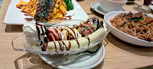 這款甜品喺冰室特式,香蕉切開兩邊,中間盛載三個雪糕球,有朱古力、雲呢拿、士多啤梨雪糕,雪糕香濃滑順,好滿足!