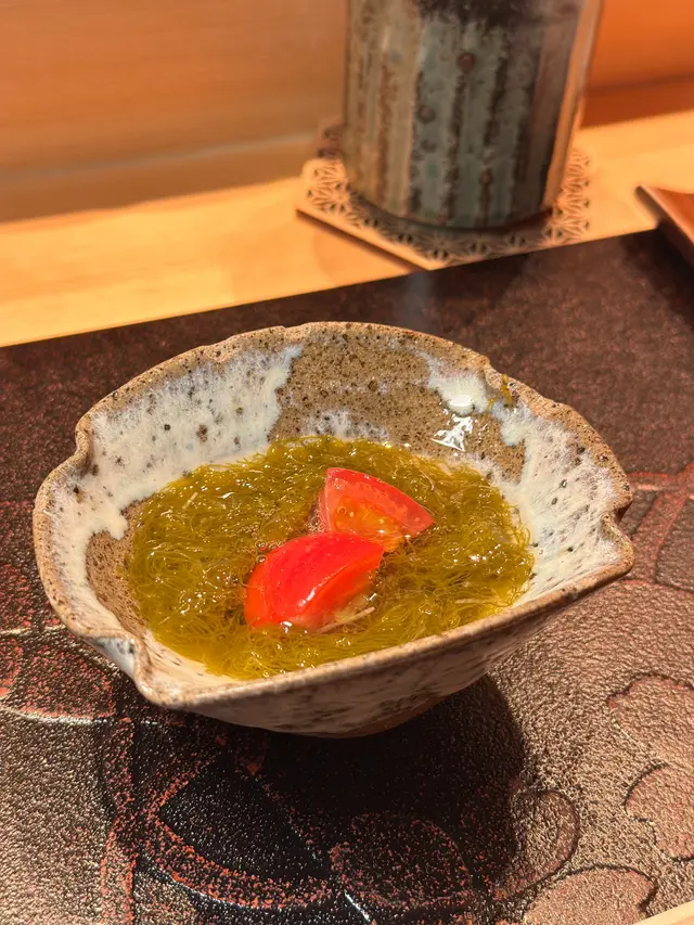 沖繩縣水雲,上面加上蕃茄,甜甜酸酸,十分開胃