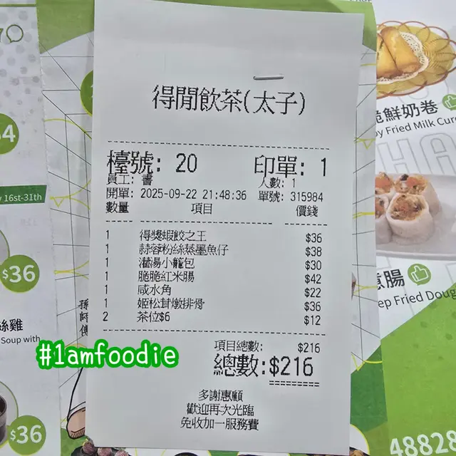 之後到 $36 嘅「得獎蝦餃之王」,今次有四粒,質素就好得多,算皮薄餡靚,難怪係招牌菜,值得一叫。最後上 $22 嘅「家鄉鹹水角」,感覺好似唔係即炸,同埋個餡唔係太好食,高要求嘅朋友可以避一避。埋單兩位夾埋 $216,應該都未必會有下次㗎喇。。。