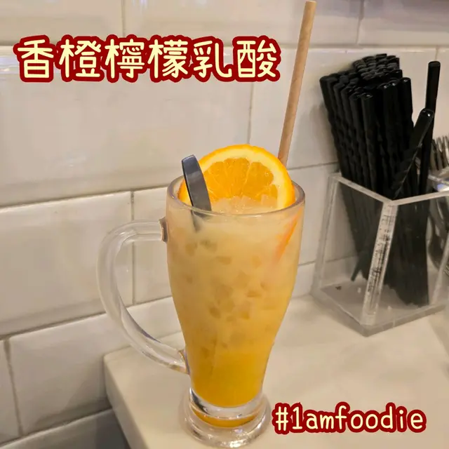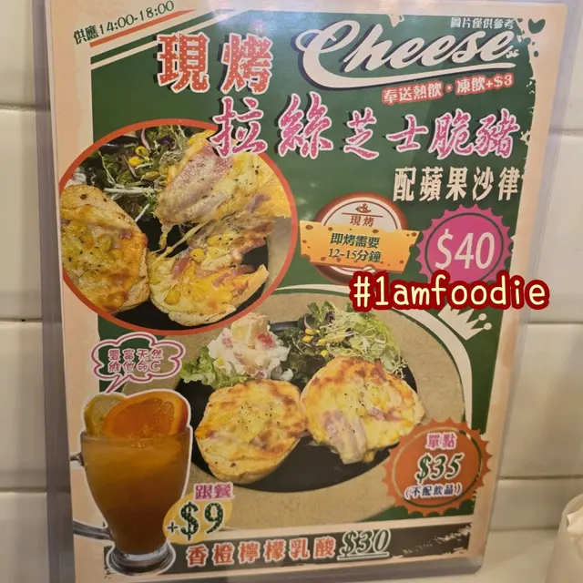 我就比較中意食吓新嘢,見佢有款下午茶賣 $40,名稱係「現烤拉絲芝士脆豬配蘋果沙律」,就叫份食吓,味道都可以。嘢飲方面,加 $9 可以飲「香橙檸檬乳酸」,非常特別,不過冰多過乜,兩啖飲晒,都幾冇癮。埋單價係 $82,佢要爭畀錢我都冇辦法。。。