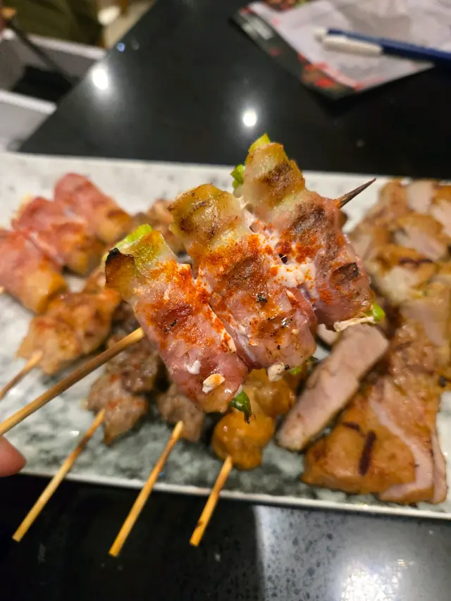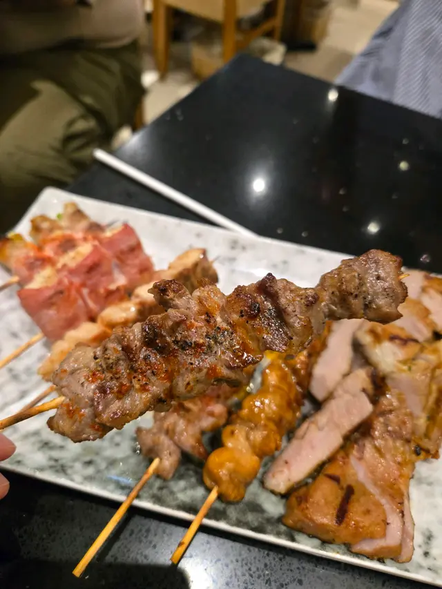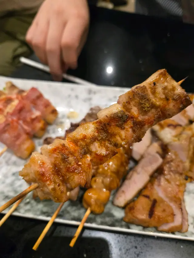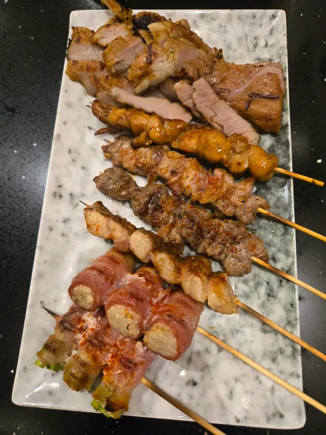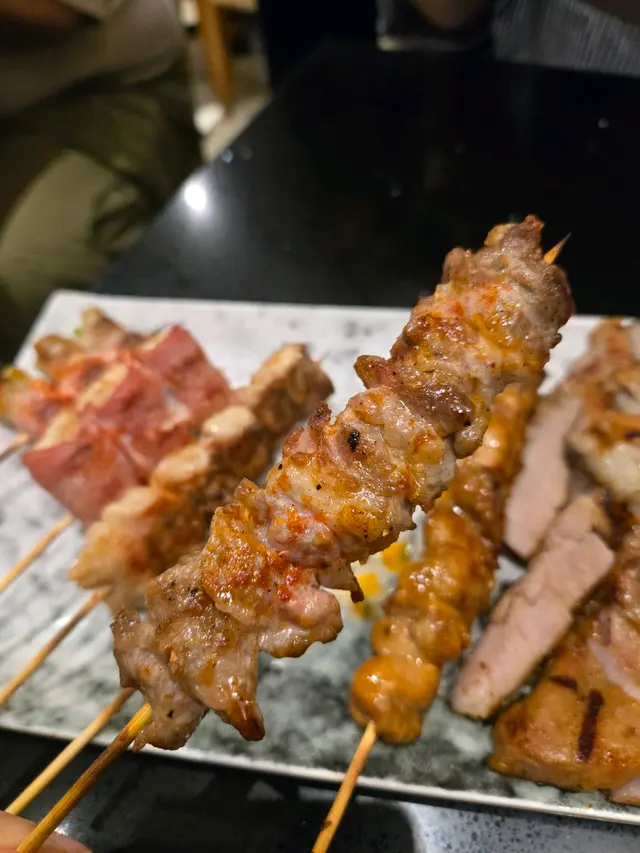 - **泰式燒豚肉($42)** :其實即係豬頸肉,面頭加咗少少泰式甜辣醬燒到微微焦香! - **日式雞柳串($20)** :雞肉好嫩滑,塗上照燒汁。