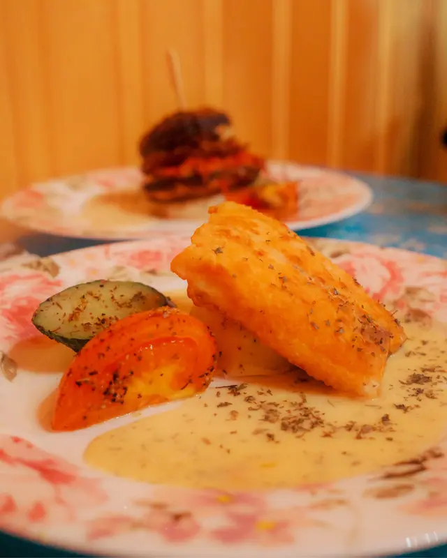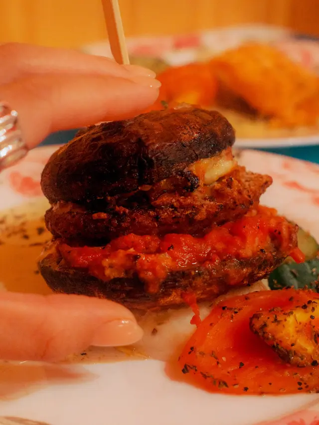 【主菜】香煎三文魚表面好香脆可口、裡面保持到魚肉嘅juicy口感,配埋底層魚皮嘅嫩感,三個口感相輔相成好正🥹 大啡菇漢堡同樣有驚喜🌟 大啡菇超juicy,一咬爆汁💦 茄蓉、洋蔥粒、菇菌粒同煙肉碎等都幫助提升肉扒嘅口感同味道層次,加上巧妙利用大啡菇代替麵包,令整體比一般burger多汁同時少份膩感👍🏻