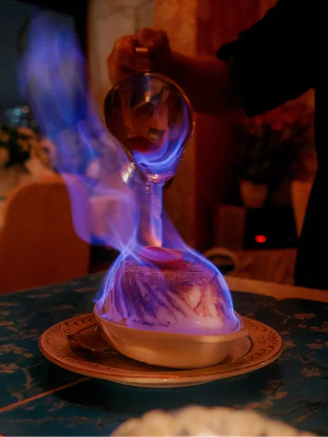 甜品】〈推薦🌟〉懷舊火焰雪山配香桃熱情果果茶呢個冰火交融真係同餐湯首尾呼應得好好👏🏼 除咗視覺享受,味道上都唔太甜🏔️ 加埋果茶清清口腔,為浪漫嘅晚餐劃上完美嘅句號🥰