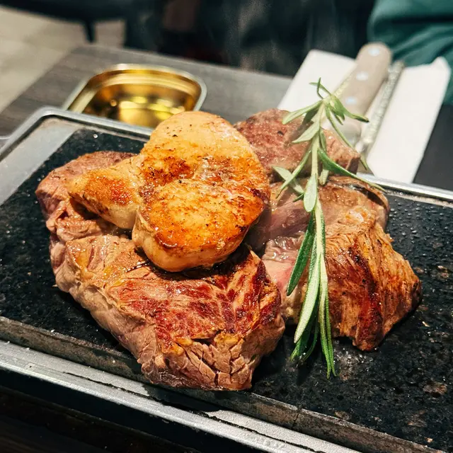 石燒熱辣上台,封門柳肉味幾濃,切開粉嫩有肉汁。鵝肝外脆內軟,配牛扒幾香口。