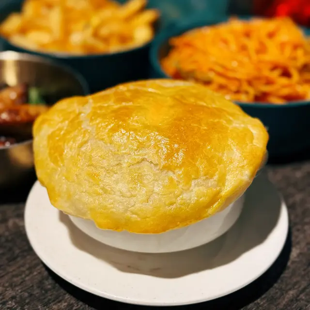 酥皮焗到金黃,浸落蘑菇湯度飲,湯底 creamy,酥皮吸滿湯幾好味。
