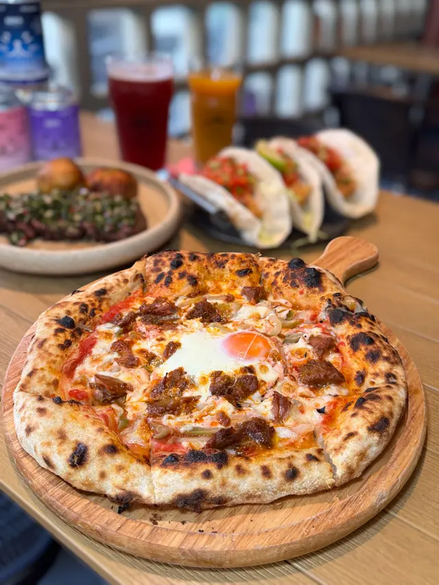 呢款Pizza係全港首創同西沙GO PARK限定,意式加上港式茶記嘅Fusion薄餅。餐廳設有大型Pizza烤爐,廚師利用烤爐炮製拿波里餅底薄餅,保証新鮮出爐熱辣辣,薄餅加上炸菜肉丁,味道鹹香,沾上半熟蛋黃好有儀式感,而餅底充滿麥香,旁邊燶邊帶有焦香,餅底口感煙靭。