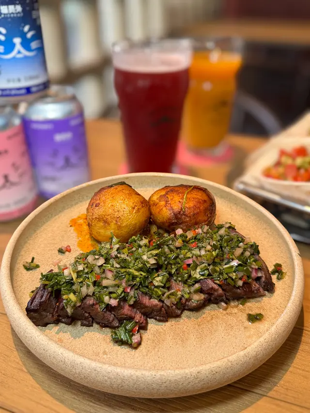 中西合璧嘅烤牛腹排,火侯控制得啱啱好,肉質粉嫩,牛肉味濃,口感軟腍有肉汁,配上強烈味道嘅中式韭茜青醬,刺激味蕾;配菜有外層微脆,內裹鬆軟嘅焗薯仔,非常滿足。