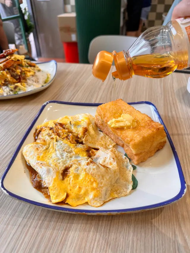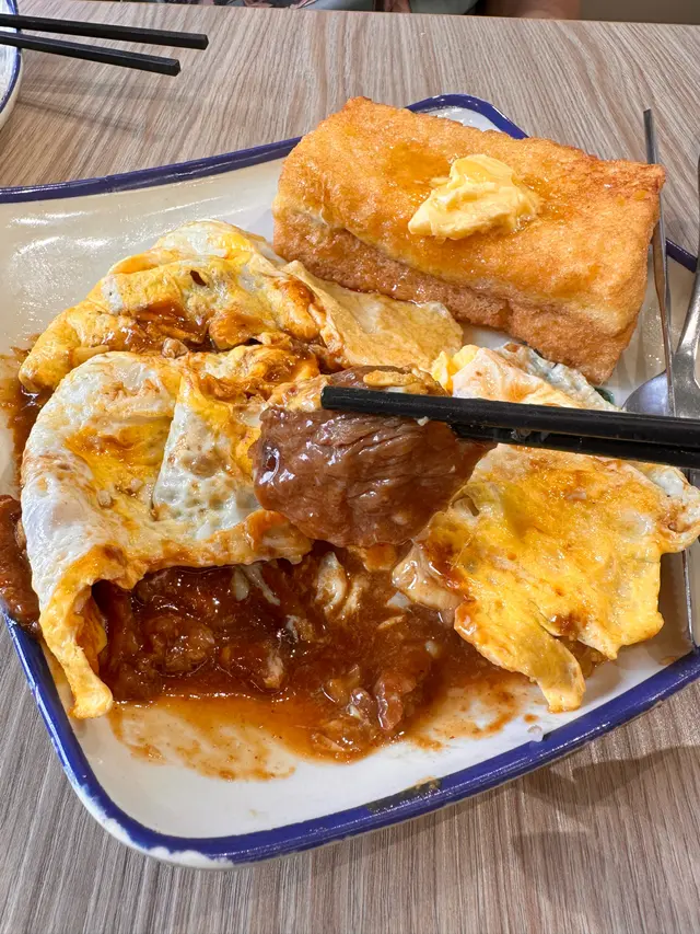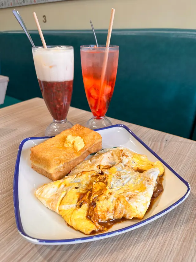 熱辣辣的厚身西多士,外層炸成香脆金黃色,質感厚身不油膩有蛋味,可自行搽上牛油或淋上糖漿。而奄列雞蛋煮得半熟,入口嫩滑柔軟,中間夾有肉質軟腍的沙爹牛肉,是份量十足的下午茶。