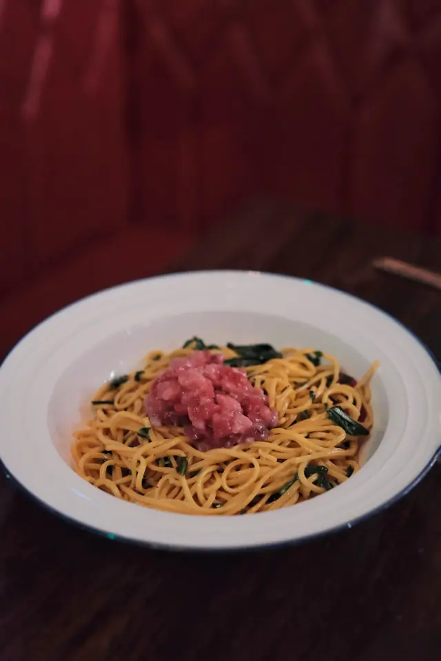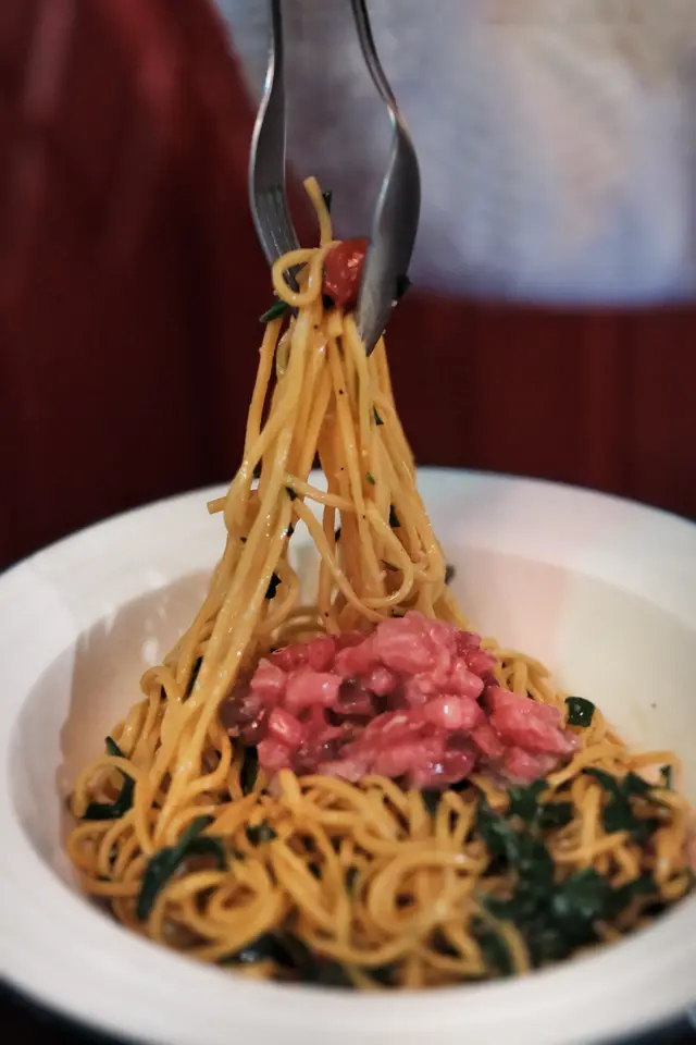 手工Tagliolini採用較幼嘅麵條,配以日本吞拿魚他他,再加入檸檬、鹽同胡椒簡單調味☺️整道麵呈現乾身爽口嘅質感,吞拿魚鮮味突出,麵條彈牙有咬口,口感清新而不油膩👍🏻這種乾身彈牙嘅麵質較為特別,與一般濕潤意粉有明顯分別,帶來獨特嘅食用體驗🥰吞拿魚他他粉紅鮮嫩,配綠葉點綴,叉起嚟麵條彈性十足。