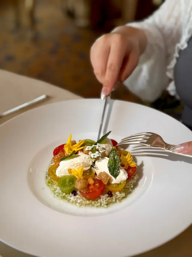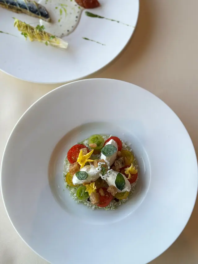 較為𝐫𝐞𝐟𝐫𝐞𝐬𝐡𝐢𝐧𝐠的這道番茄𝐬𝐚𝐥𝐚𝐝也絕不馬虎,底部是番茄𝐣𝐮𝐢𝐜𝐞製成的𝐣𝐞𝐥𝐥𝐲,搭配奶香的𝐛𝐮𝐫𝐫𝐚𝐭𝐚 𝐜𝐡𝐞𝐞𝐬𝐞,簡約中帶點奢華精緻🍅