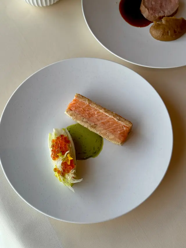 這是以鬆脆的𝐛𝐫𝐢𝐨𝐜𝐡𝐞(牛油麵包)夾住三文魚的𝐬𝐚𝐧𝐝𝐰𝐢𝐜𝐡,𝐬𝐥𝐨𝐰-𝐜𝐨𝐨𝐤𝐞𝐝三文魚魚肉油脂激發,魚身滑溜,搭配帶點酸甜的𝐬𝐚𝐮𝐜𝐞調味,出色🐟(一旁的羅馬生菜用上三文魚子點綴,也相當有心思)